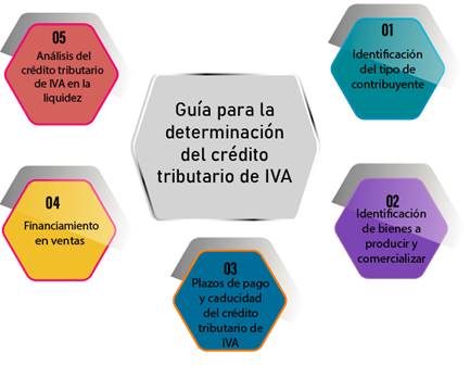 The objective of this research is to design a guide for the determination of the VAT tax credit in companies in the manufacturing sector that allows the improvement of their liquidity in the short term. The type of research was descriptive with a non-experimental cross-sectional design, since it worked with the financial statements of certain manufacturing companies in the city of Cuenca, without manipulating the study variables. It is observed that the acquisitions of services that are subject to a tax credit in a manufacturing company have a greater disadvantage for the unequivocal distribution in the productions with different rates, the most common cases of purchases for services and that have this difficulty are the expenses of security and cleaning. A guide was made for the determination of the VAT tax credit, which contributes to an efficient payment of taxes.