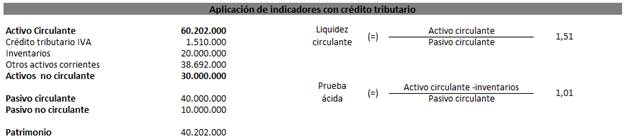 Con respecto a los ejemplos antes observados, en el primer caso con crédito tributario y en el segundo valor a pagar, en las figuras 9 y 10 se realiza un análisis de la influencia de una eficiente estructura del crédito tributario de IVA conforme el artículo 66 de la LRTI, a partir de este análisis se aplica los indicadores financieros de liquidez y prueba ácida, los mismos que demuestran disminución de los índices cuando existen valores a cancelar a favor del SRI.