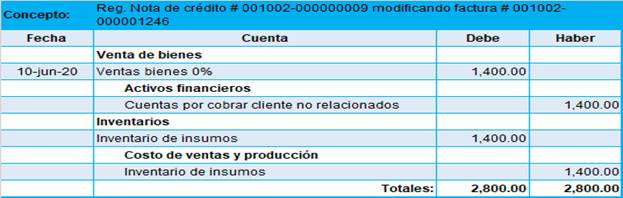Devolución en ventas: la devolución de un artículo corresponde por defecto de la mercadería o no conformidad con el producto por parte del cliente, vuelve a ingresar a bodega, se realiza una nota de crédito y un asiento contable que es contrario al reconocimiento de ventas (figura 9)