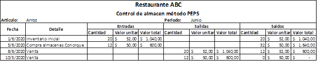 Según lo antes mencionado, se aprecia lo importante que es tener un control eficiente de los inventarios y en este caso se basará en un sistema de inventario permanente de valoración PEPS, que facilita la salida de materia prima que ingresó primero al almacén, evitando el daño o caducidad de los productos, para ello, es fundamental el manejo y la utilización de kárdex por cada producto en donde se registrará las entradas y salidas de mercancía así como las existencias, tal como se muestra en la figura 4: