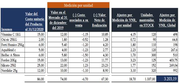 La Compañía XXXX, vende insumos para camarón de los cuales se ha determinado que existe al 31 de diciembre del 2019, una pérdida por Medición de Valor Neto de Realización, las cuales se presenta a continuación, (figura 2):
