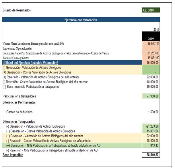 La conciliación tributaria establece en el ejemplo una utilidad de 45.000,00 incluida la valoración de activos biológicos por 21.283,36, se agrega la reversión por ingresos y costos del año 2018, por lo que se genera la base de cálculo de participación a trabajadores de 49.000,00, se aplica el 15% a fin de obtener la participación. A la base antes mencionada se les resta la participación a trabajadores, se resta el resultado entre los ingresos por generación y los gastos por diferidos, se adiciona los gastos no deducibles y se genera la base del impuesto a la renta con una tarifa impositiva del 25%. (ver figura 10), se exponen a continuación:
