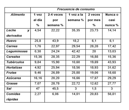 En la tabla 3, Identificación de la frecuencia de consumo de alimentos en los estudiantes de la Unidad Educativa “Alberto Enríquez”, Atuntaqui, Imbabura; se demostró que existe un consumo alto de cereales, grasas, huevos, frutas y sal; consumo moderado de lácteos, carnes y leguminosas; y bajo consumo de tubérculos, hortalizas, azucares y comidas rápidas. Los datos relevantes y de riesgo nutricional son consumo alto de grasas 28,78% (dos a cuatro veces por semana), sal 47% (1 vez al día) y un bajo consumo de hortalizas 31,62%.