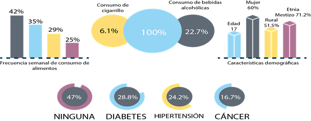 En la tabla 4, sobre la identificación de factores de riesgo como son las Enfermedades crónicas no transmisibles como antecedentes patológicos familiares de los adolescentes, los más relevantes son diabetes el 28,8%, hipertensión 24,2% y cáncer 16,7%; y quienes no presentan antecedentes patológicos familiares son el 47%.