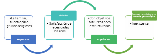 Sin embargo, con el advenimiento de los procesos de la industrialización, la modernidad, sumado a la discriminación hacia los adultos mayores por razones de productividad y por lo tanto su exclusión y sometimiento a condiciones de extrema pobreza, enfermedades, abandono, el cuido de las personas mayores fueron asumidas por parte de personas con espíritu filantrópico y grupos religiosos, ofreciendo la satisfacción de las necesidades básicas para la subsistencia.