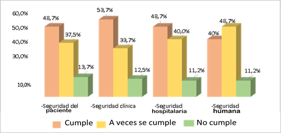 La categoría seguridad clínica es fundamental para la seguridad del paciente, en ella se incluyen acciones de seguridad acerca del diagnóstico, tratamiento, procesos de atención, de acuerdo a los resultados se encontró que el 53,7% cumple con las diferentes acciones que están relacionadas estrechamente con la atención directa de los pacientes en base a los conocimientos, actitudes y habilidades de los profesionales de salud; se obtuvo que el 33.7% a veces cumple y el 12.5% no cumple. En cuanto a la categoría seguridad hospitalaria se registró que el 48,7% considera que el Hospital Básico Jipijapa cumple con las condiciones para brindar una atención integral a los pacientes que acuden por atención médica; se tiene un resultado no muy lejano con 40% al ítem que a veces cumple y el 11,2% no cumple. En la categoría de seguridad humana se obtuvieron resultados donde el 40% de profesionales de esta casa hospitalaria cumple en cuanto a la protección del paciente a riesgos de exposición, situaciones de peligro, el 48.7% a veces cumple y el 11.2% no cumple.