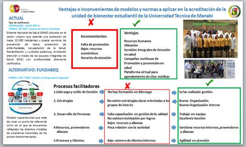 Recursos sanitarios en el área donde se localiza la unidad de gestión clínica: hospital clínica: hospital público privado, centro de salud, cartera de servicio. Se considera un centro de Salud ubicado en los predios de la Universidad Técnica de Manabí el cual brinda atención al personal docente, administrativo y estudiantil de dicha institución.