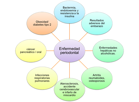 Los principales hechos supuestos que respaldan la conexión biológica entre la periodontitis y las enfermedades sistémicas son (a) la implicación habitual de la infección en la patogénesis de ambas enfermedades, (b) bacteriemia transitoria y de bajo grado y endotoxemia causada por enfermedades periodontales, (c) inmunidad sistémica respuestas e inflamación desencadenadas por enfermedades periodontales, (d) expresión de factores de virulencia por patógenos periodontales, y (e) presencia de patógenos periodontales en tejidos no onerosos como placas ateromatosas (Paquette, 2002; Bansal, Rastogi y Vineeth. 2013; Shangase et al., 2013). Aunque los mecanismos detallados que subyacen a esta asociación aún no están claros, los informes disponibles demuestran evidentemente un vínculo bidireccional entre el mecanismo de las enfermedades periodontales y las enfermedades sistémicas / metabólicas donde ambas afecciones podrían agravarse entre sí (Taylor, 2008; Mealey y Rethman, 2003; Abe et al., 2006).