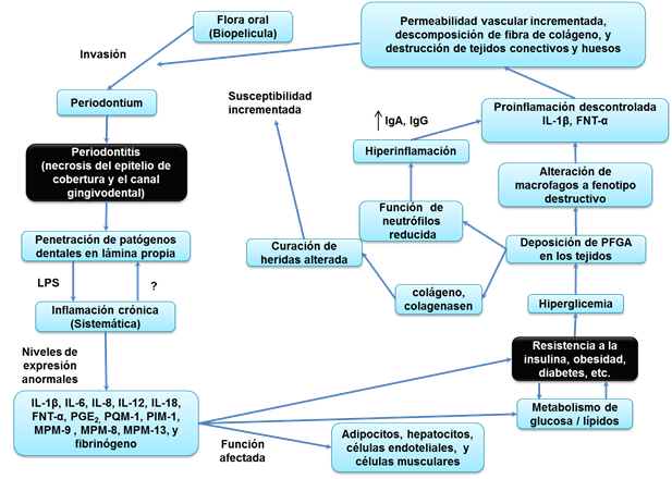 La formación de PFGA puede influir en la estabilidad del colágeno y la integridad vascular y también podría agregar receptores de macrófagos y monocitos, lo que agrava la susceptibilidad a la periodontitis a través de la estimulación de IL-1 y FNT - α (Lazenby y Crook, 2010) (Figura 2). Se sabe que estas citocinas inflamatorias estimulan la resistencia a la insulina y varias otras complicaciones inflamatorias crónicas, incluida la periodontitis (Mealey y Ocampo, 2007). Además, el hecho de que FNT-α e IL-6 se producen en los tejidos adiposos también podría apoyar el vínculo compartido entre la obesidad, la DM2 y la periodontitis (Nagasawa et al., 2010).