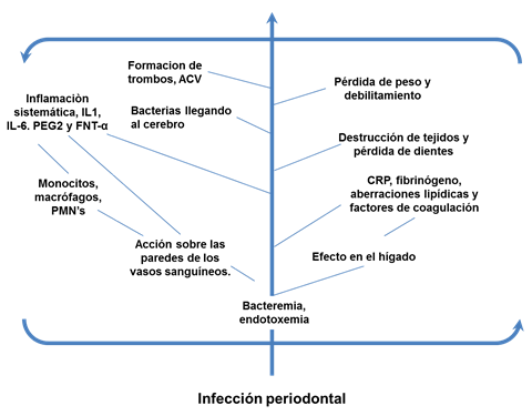 Debido al papel predominante de las bacterias anaerobias gramnegativas en las infecciones periodontales, el epitelio de bolsillo ulcerado se convierte en una fuente crónica de desafío sistémico a partir de bacterias, productos bacterianos y mediadores inflamatorios producidos localmente. Además, como consecuencia de la alta vascularización, el periodonto inflamado puede actuar como una fuente endocrina de mediadores inflamatorios (como FNT-α, IL-6 e IL-1) que son importantes en la inflamación periodontal y también pueden influir metabolismo de glucosa y lípidos (Grossi y Genco, 1998) (Figura 2).