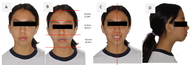 En el análisis de los tercios se determinó que el tercio medio se encuentra aumentado (B). En la fotografía de sonrisa se aprecia que la línea media facial con la línea media dental inferior no coincide, una sonrisa amplia que no expone en exceso el tejido gingival y no presenta corredores bucales (C). En la fotografía de perfil se observa un perfil convexo, contorno de la nariz recto, curva de Arnnet plana, ligera incompetencia labial, protrusión del labio superior e inferior y el músculo borla del mentón contraído (D).