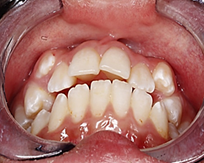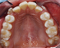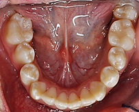 Fotografía oclusal superior: Forma de arcada ovoide, apiñamiento en el sector anterior, palatinización de las piezas 1.2 y 2.2, piezas 1.3 y 2.3 ectópicas, paladar profundo (D). Fotografía oclusal inferior: Forma de arcada oval, lingualización de las piezas 4.5 y 4.6, ausencia de la pieza 3.7 (E). Fotografía de resalte: La sobremordida horizontal y vertical de -2 mm (F).