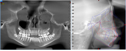 El análisis de discrepancia se realizó sobre los modelos de estudio obteniendo una discrepancia superior de - 4mm y una discrepancia inferior de -1.8 mm (G). En la ortopantomografía se observa que el seno maxilar izquierdo aparece velado, presencia de los 4 gérmenes de los terceros molares, cornetes hipertróficos, no se visualiza ensanchamiento del ligamento periodontal, no existen patologías periapicales (H). Los estudios cefalométricos que se realizaron fueron Rickkets, Jaraback y Steiner, obteniendo como resumen: patrón esqueletal Clase II por protrusión maxilar, a nivel de incisivos: protrusión y proinclinación del incisivo superior e inferior, VERT: +0,69 dándonos un patrón facial: braquifacial suave, en las esferas rotacionales de Jarabak: 54% indicándonos una tendencia a crecimiento rotacional posterior (I).