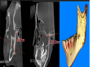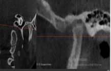 A través de los cortes tomográficos (Figura 3) se pudo observar que la rama mandibular derecha medía 43.85 mm y la izquierda 39.53 mm dando una diferencia de 4.34 mm lo que evidencia que la asimetría que presenta la paciente es a causa de la discrepancia de tamaño de las ramas mandibulares (A).