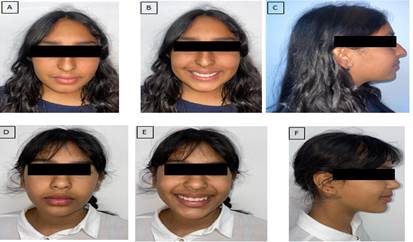 El examen clínico extraoral revela que las pacientes del caso 1 y 2, presentan perfil recto, leve asimetría facial, con tercios faciales levemente desproporcionados, labios competentes, sonrisa media para ambos casos, línea media facial coincidente con línea media dental, distancia intercantal coincidente con la distancia interalar, distancia bipupilar no coincidente con la distancia bicomisural; ángulo nasolabial con valores dentro de la norma (107°), labios dentro de la norma para el caso 1, según Legan y Ricketts; para el caso 2, se evidencia ángulo nasolabial aumentado (114º), presentando retrusión labial y proquelia, a nivel del labio inferior (+1,8mm) según Legan y Ricketts (Figura 1).