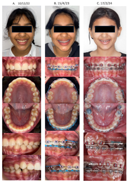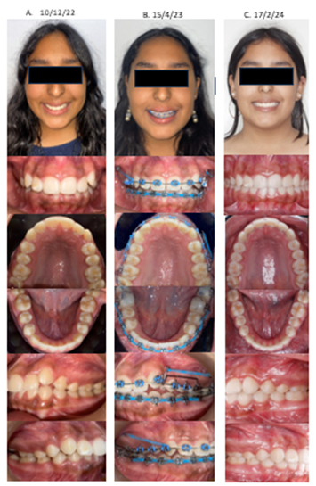 Los resultados del tratamiento, del caso 1 (Figura 3), muestran que con la distalización se logró obtener una correcta relación Clase I, lográndose una mejor estética y función con respecto a la relación molar, canina y guía anterior. Se logró mejora del perfil, mejora de la sonrisa, que se traduce en un aumento de la autoestima y mejor calidad de vida de la paciente. El tiempo de logro para la corrección fue de un año y tres meses. Los efectos colaterales observados durante el tratamiento fueron la apertura de la mordida, pero en este caso fue favorable ya que la paciente presentaba mordida profunda.