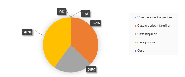 En la tabla y grafico 6, se presenta el análisis del indicador vivienda. En la que se aprecia que el 40% de los pacientes investigados poseen casa propia y el 37% manifestó vivir con algún familiar. Seguido del 23% que viven en casa alquilada. Ningún paciente vive en casa de los padres o tiene otro modo de vivienda.