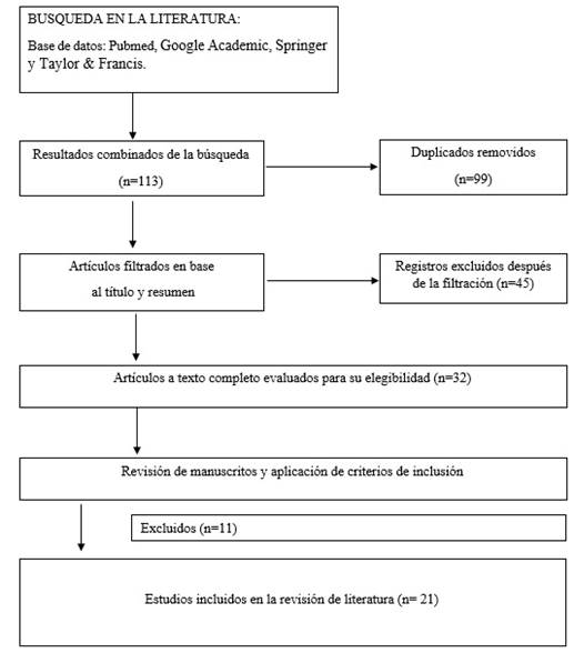 Para esta revisión se estableció un registro de base de datos siendo: 42 artículos de Pubmed 8 Google Academic, 62 Springer y 1 Taylor y Francis, estableciendo un total de N= 113 estudios. Se realizo un primer cribado dejando 113 artículos; luego de esta selección, se eliminó la bibliografía duplicada, quedando 99 artículos. Después de verificar todos los registros, se excluyeron 78 estudios sin cumplir los criterios de selección, lo cual permitió identificar 21 artículos adecuados para esta revisión de literatura. En esta revisión se consideró que los estudios de revisión de la literatura representaron el 24%, de estudios observacionales el 19%, revisiones sistemáticas 10%, estudios de validación 5%, revisiones narrativas 9%, estudios controlados aleatorizados 5%, libros 5%, estudios de cohorte 14% y estudios transversales 9%.