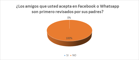 Según los datos obtenidos el 100% de los adolescentes manifestaron que sus padres no revisan a quienes aceptan o tienen de amigos en sus redes sociales.