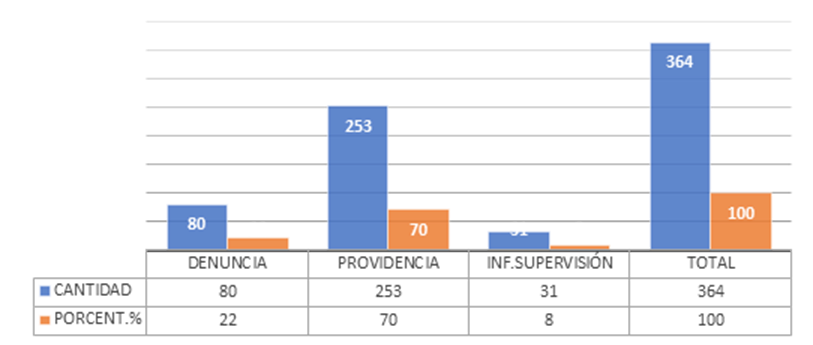 En todo caso, si un expediente permaneciese en sede contravencional, la respuesta del estado a quien se presume víctima, sería mucho más ágil por cuanto, dentro de esta sede se manejan términos y plazos más cortos, así como sanciones menos rigurosas. Siendo así, se estaría dando cumplimiento al principio de celeridad, debida diligencia, entre otros consagrados en la Constitución de la República, así como en Instrumentos Internacionales de Derechos Humanos. En porcentajes reducidos se receptan en la Fiscalía denuncias directas ya sean estas escritas u orales (22%) y también informes de supervisión (8%); éstos finalmente, al momento de receptarlos, existe la posibilidad de filtrarlos; no así las investigaciones que tienen como origen una providencia, por cuanto, al ser una disposición judicial esta se considera de obligatorio cumplimiento.