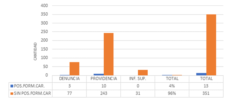 Al ser las investigaciones iniciadas a partir de una providencia judicial, la principal causa de la sobrecarga procesal que hemos venido desarrollando, resulta necesario subrayar que, del total de estos expedientes únicamente el 4% es susceptible de una formulación de cargos. Recalcamos lo infructuoso de estas investigaciones y hacemos especial énfasis en que, la posible solución sería que estas investigaciones puestas en conocimiento de la fiscalía general del Estados permanezcan en sede contravencional.