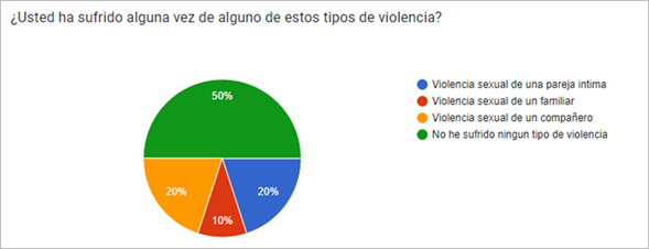 El 50 % de los encuestado son personas que no han sufrido de ningún tipo de violencia sexual y el 20 % sufren de violencia por parte de la pareja o por un extraño.