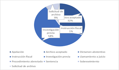 En la tabla 2 y en la figura 2 se puede evidenciar claramente el estado en el que se encuentran cada uno de los expedientes, donde se aprecia que ninguna de las causas se ha resuelto, ya que de las 101 que ingresaron a la Fiscalía del cantón Ambato, hay un alto porcentaje que se encuentran en investigación previa, otras han sido archivadas y las restantes se encuentran en trámite penal con solicitud de archivo, es decir que no han sido procesadas.