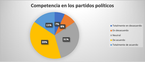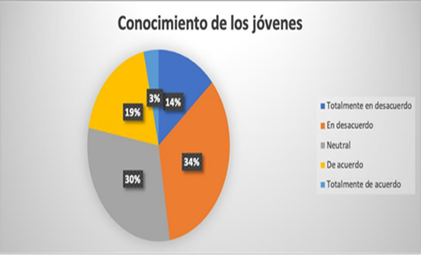 Al observar la figura 3, la mayor parte de la población encuestada está en desacuerdo en que el conocimiento que poseen los jóvenes sobre los distintos partidos políticos es suficiente para poder ejercer el voto. Ellos necesitan conocer a profundidad cada una de las propuestas mediante métodos que llamen la atención de los jóvenes para que puedan votar de manera responsable. La otra parte de la población se mantiene neutral con una perspectiva diferente al primer punto de vista.