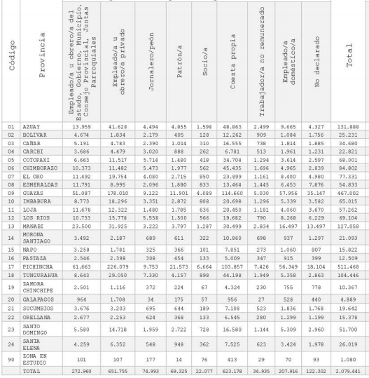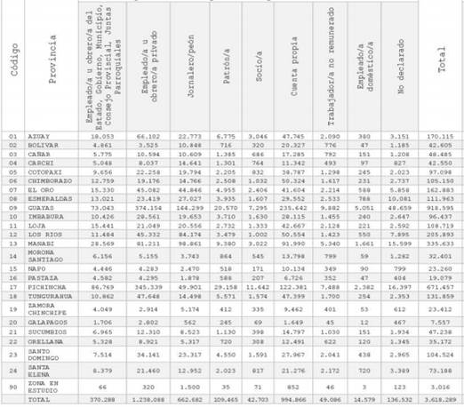 Es evidente que, hasta nuestros días pese a todas las reformas y reconocimientos que se han establecido en cada una de las Constituciones desde el año 1830 hasta la del año 2008 en el Ecuador, ha sido imposible sellar esta brecha de desigualdad, en lo referente a la accesibilidad en el empleo en un número igualitario de mujeres frente a los trabajadores varones, como se puede apreciar que en las diferentes categorías de ocupación el mayor número de empleabilidad se da en la categoría de empleados y obreros del sector privado, destacándose en los cinco primero lugares las provincias de Guayas, Pichincha, Manabí, Azuay y Tungurahua, a diferencia de que en el trabajo autónomo o por cuenta propia marca un segundo puesto en el desarrollo productivo, en la que también se destacan las tres primeras provincias nombradas, sumándose Los Ríos y Chimborazo con mayor actividad laboral en esta ocupación.