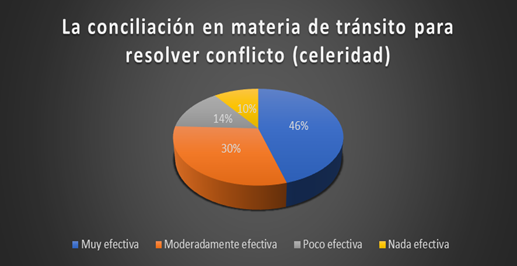 En la figura 1, puede evidenciarse que el 100% de encuestados (jueces y abogados), solo el 46%, manifestaron que la conciliación en materia de tránsito es efectiva para resolver conflictos de manera muy efectiva. Y sólo el 30% de encuestadas expresaron moderadamente efectiva. Y sólo el 14 % de encuestadas declararon poco efectiva. Un 10% declaró nada efectiva.