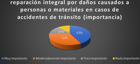 En la figura 2, se evidencia que el 100% de encuestados (jueces y abogados), solo el 43%, manifestaron la reparación integral por daños causados a personas o materiales en casos de accidentes de tránsito es muy importante. Por su parte el 32% declararon moderadamente importante. Y sólo el 14% expresaron poco importante. Y sólo el 11 % de encuestadas declararon nada importante.