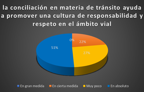 En la figura 4, se observa que el 100% de encuestados (jueces y abogados), solo 51%, manifestaron la conciliación en materia de tránsito ayuda en gran medida a promover una cultura de responsabilidad y respeto en el ámbito vial. Por su parte el 27% declararon en cierta medida. Y sólo el 22% expresaron muy poco.