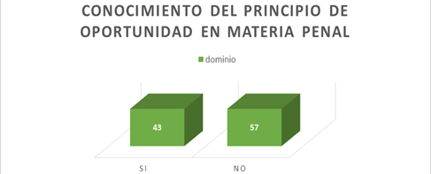 Sin embargo, en cuanto al conocimiento del Principio de Oportunidad, solo el 57% de los encuestados indicó que no estaba familiarizado con el principio. Esto indica que una proporción significativa de participantes no está familiarizada con los detalles y la aplicación del principio de oportunidad en los procesos penales. Por otro lado, podemos ver que solo el 55% de los encuestados dijo tener conocimiento sobre el Principio de Oportunidad. Esto indica que un porcentaje significativo de los encuestados tiene conocimientos sobre este tema. En definitiva, los resultados indican que una proporción importante de los encuestados desconoce el principio de oportunidad, mientras que otra proporción más pequeña está reconociendo este principio en el contexto del proceso penal. (Figura 1).