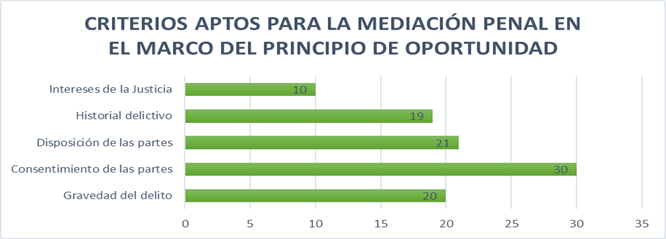 Según los resultados de la encuesta, se puede observar en la figura 2 que existe una variedad de opiniones en cuanto a los criterios del Principio de Oportunidad para la mediación penal. En relación con el consentimiento de las partes, solo el 30% de los encuestados indicó que considera este criterio como fundamental para que se lleve a cabo la mediación penal. Esto significa que una parte minoritaria de los encuestados considera que la voluntad de ambas partes es esencial para iniciar el proceso de mediación.