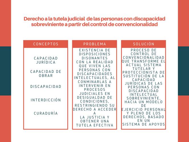 La realidad expuesta ubica el análisis en los conceptos relacionados a la capacidad jurídica, capacidad de obrar, discapacidad, interdicción, la curaduría y la perspectiva de que las personas con discapacidad intelectual sobreviniente son sujetos de derechos y que en virtud de su capacidad de ejercicio requieren de apoyos para acceder a la justicia y no de sustitución de ésta, a través de la designación de un curador en un proceso de interdicción, es por ello, que para resolver el problema de investigación se plantea la siguiente pregunta: ¿Cómo se puede garantizar el derecho a la tutela judicial efectiva de las personas con discapacidad intelectual sobreviniente en los procesos judiciales iniciados en su contra? En relación a la problemática expuesta se establece como objetivo proponer el control difuso de convencionalidad como alternativa viable que permita hacer efectivo el derecho a la tutela judicial efectiva de las personas con discapacidad intelectual sobreviniente en los procesos judiciales en los que intervienen en calidad de demandados.