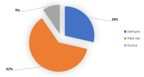 Sobre la determinación de si se cumplen o no los términos en la tramitación de la acción de protección, se observó que el 62% de la unidad de análisis considera que rara vez se cumplen los términos en la garantía constitucional de la acción de protección; y tan solo el 9% afirma que nunca se cumplen, a diferencia del 29% de encuestados que estiman que siempre se aplican los términos procesales (ver figura 2). De las evidencias obtenidas se establece que la tramitación de la acción de protección no se cumple en su totalidad los términos procesales establecidos en la LOGJCC lo que ocasiona que la vulneración del derecho no sea tutelada de manera oportuna.