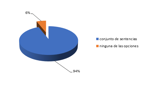 El 100% de los encuestados manifestó tener conocimiento acerca del objetivo de la AP, es mismo que consiste en tutelar de manera inmediata la vulneración del derecho, puesto que funciona como un mecanismo de defensa efectiva de los principios determinados en la norma suprema constitucional. En lo referente a la jurisprudencia, el 94% (ver figura 1) de los encuestados consideran que son un conjunto de sentencias emitidas por la CCE, mientras que, el 6% determinan que ninguna de las opciones presentadas en la encuesta corresponde al término jurisprudencia, es decir, se demostró de forma clara el valor significativo que tiene un precedente jurisprudencial con carácter vinculante para un Estado constitucional.