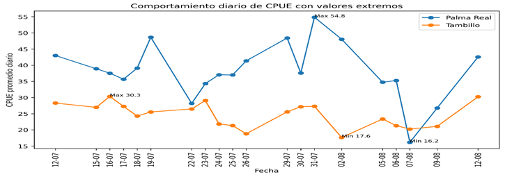 Para comparar la dinámica del rendimiento pesquero entre las dos estaciones, se analizaron parámetros estadísticos de la captura por unidad de esfuerzo (Tabla 2). La estación Palma Real obtuvo un valor promedio diario de CPUE mayor al presentado en Tambillo, con una mayor dispersión de los valores.