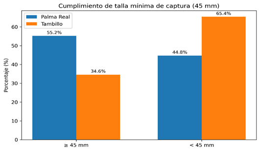 Figura 2. Cumplimiento de la talla mínima de captura (45 mm) para Anadara tuberculosa en las estaciones Palma Real y Tambillo.