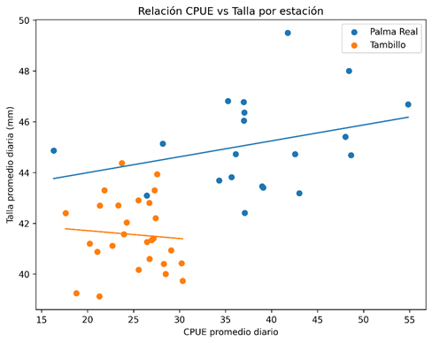 La Figura 3 muestra los valores promedio diarios. En ambas estaciones se observó una tendencia positiva entre las variables, evidenciada por las líneas de regresión ajustadas para cada conjunto de datos. Sin embargo, la dispersión de los datos indica variabilidad en la respuesta, particularmente en rangos intermedios de CPUE.