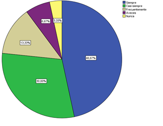 La figura 1 evidencia que 46,67% de los padres de familia recomiendan a los profesores que siempre deben utilizar la metodología activa flipped classroom en el proceso de enseñanza aprendizaje con los estudiantes, frente a un 30% que prácticamente coinciden que la metodología de debe utilizar casi siempre arrojando así un resultado positivo a favor de la incidencia que tiene la metodologia dentro del proceso educativo.Esto desde el punto de vuista de los padres de familia o representantes legales.