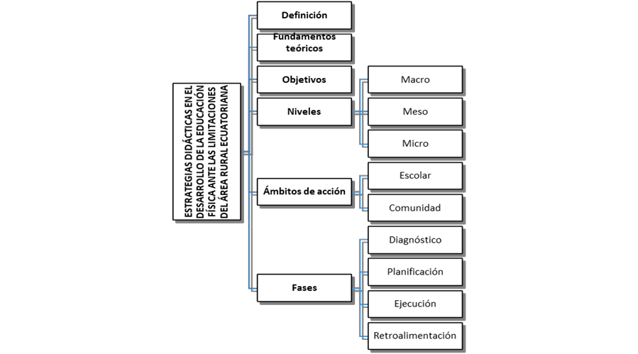 Las estrategias didácticas para la enseñanza de la Educación Física en el área rural del Ecuador parten de la definición del constructivismo socio-cultural como fundamento pedagógico que prioriza el papel esencial del estudiante como centro del proceso de formación y constructor del conocimiento. Así mismo, de la consideración del contexto como componente necesario para el desarrollo de un proceso formativo vinculado con las realidades en las que se encuentra inmerso el estudiante. La propuesta de estrategias didácticas considera acciones en los diferentes niveles de concreción del currículo (macro- meso- micro) y se estructura de manera secuencial en con cuatro fases: diagnóstico, planificación, ejecución y retroalimentación.