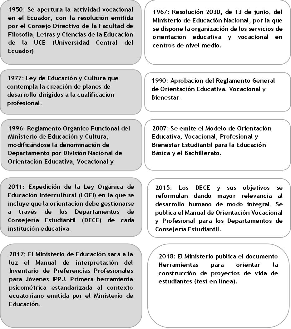 Por consiguiente, se presenta un breve recorrido por la historia de la actividad vocacional en el Ecuador, la cual se remonta a la década de los 50 del siglo XX, en la figura 1, se muestra las fechas legislativas más relevantes de su evolución, consolidadas bajo el marco de la ley, normas, reglamentos y acuerdos que se emitieron en varios periodos.