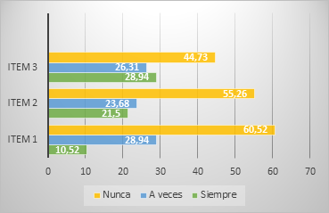 La Figura 1 representa los resultados para la dimensión 1: Eje de desarrollo personal y social. Allí se muestran los resultados de cada ítem en cálculo de porcentaje. En relación con el ítem 1, sobre el uso de los medios audiovisuales para dar a conocer a los alumnos aspectos de identidad propia, el 60,52% indicó que nunca los utilizan y el 28,94% a veces y el 10,52% siempre, siendo este un porcentaje considerable de docentes que poco los emplean para este fin. En el ítem 2, un 55,26% de los docentes igualmente manifiesta que nunca utilizan los medios audiovisuales para potenciar la autonomía, 23,68% a veces y 21,5% siempre. En relación al ítem 3, un 44,73% de los docentes, en ningún momento, los usan para aspectos relacionados con el establecimiento de los primeros vínculos afectivos, 26,31% a veces y 28,94 siempre los emplean.