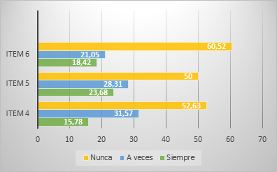 Se evidencia en la Figura 2 las derivaciones de la dimensión 2: Eje de desarrollo personal y social, donde los resultados se manifiestan de manera similar al gráfico anterior. En el ítem 4, el 52, 63% de los docentes encuestados no emplean los medios audiovisuales como herramienta de interacción con los elementos de su entorno, mientras que 31,57% los usan a veces y 15,78% siempre. Por otra parte, en el ítem 5, el 50% manifiesta nunca haberlos usado para fomentar la curiosidad y desarrollar procesos de indagación, el 28,31% respondió a veces y el 23,68% siempre. Finalmente, el 60,52% no lo emplean como herramienta de utilidad para la comprensión de las relaciones lógico-matemáticas de los estudiantes, el 21,05% a veces y el 18,42% siempre.