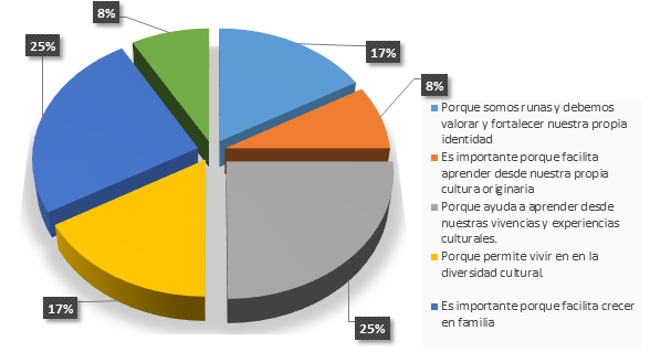 Las razones por las que se considera importante aprender y enseñar desde la identidad cultural, impulsan el diseño y desarrollo de un modelo pedagógico intercultural, capaz de garantizar el aporte teórico que fundamente el desarrollo de un sistema educativo intercultural, en un estado plurinacional. Esto significa que el hecho de ser runas que debemos valorar y fortalecer nuestra propia identidad, represente el 17% de intencionalidad educativa; otra de las razones que se manifestó es la importancia de los saberes ancestrales porque facilita aprender desde la propia cultura originaria, intencionalidad que se expresa en un 8%; mientras tanto un 25% expresa la razón porque ayuda a aprender desde nuestras vivencias y experiencias culturales; de la misma manera un 17% de participantes de la experiencia pedagógica intercultural manifiestan que esta pedagogía permite vivir en la diversidad cultural; así mismo un 25% de participantes piensan que es importante porque facilita crecer en familia; y, finalmente un 8% de participantes no opinan.