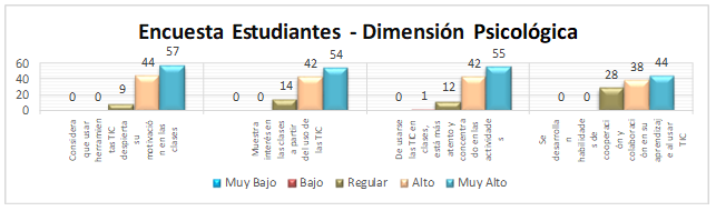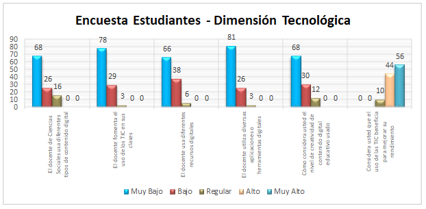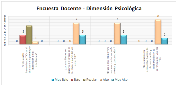 En la encuesta dirigida a los docentes del área de Ciencias Sociales de la Unidad Educativa Fiscal Cinco de Junio del cantón Manta de la provincia de Manabí, se realizaron preguntas enfocadas en las dimensiones tecnológica, pedagógica y psicológica, donde se detalla a continuación los resultados obtenidos: