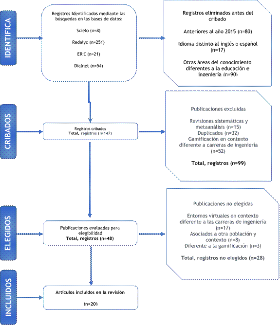 Los artículos deben contener estudios cualitativos, cuantitativos o mixtos, abordar la temática de educación en ingeniería relacionada con la gamificación en el proceso de enseñanza aprendizaje en carreras de ingeniería. Se excluyen los estudios teóricos; no se considerarán para su inclusión los escritos en un idioma distinto del español e inglés y aquellos publicados en fecha anterior al año 2015. Además, serán descartados los artículos que contengan revisiones sistemáticas o metaanálisis.