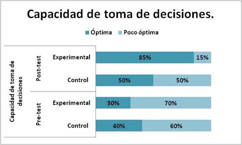La figura 3 indica que, en el pre-test, 40% del grupo control obtuvo un resultado óptimo en la capacidad de toma de decisiones, mientras que un 60% mostró un desempeño poco óptimo; asimismo, 30% de los estudiantes pertenecientes al grupo experimental obtuvo un resultado óptimo y 70% poco óptimo. Con relación al post-test, 50% del grupo control obtuvo un avance óptimo, mientras que el 50% obtuvo un avance poco óptimo; por el contrario, 85% del grupo experimental logró un progreso óptimo y 15% poco óptimo. Por ende, se pudo corroborar que el grupo experimental demostró tener mejor capacidad de toma de decisiones que el grupo control después del post- test; sin embargo, el grupo control también alcanzó una pequeña mejora con respecto al pre-test. Este hallazgo se complementa con la opinión de Jaramillo y Simbaña (2014), quienes expresan que “el ser humano es capaz de resolver problemas y conflictos, tomar decisiones acertadas, buscar alternativas y reflexionar, todo ello contribuye a la adquisición de nuevos aprendizajes que se fortalecerán con la práctica de estrategias metodológicas” (p. 301).