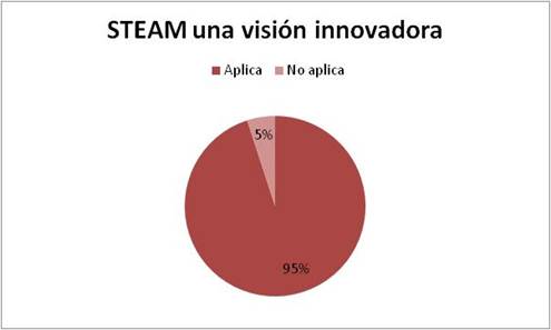 En la figura 4 se puede notar que el 95% de los estudiantes de ingeniería opinaron que la metodología STEAM aplica como una visión innovadora, mientras que el 5% opinó que no aplica. En este particular, cabe citar a Domènech et al. (2018), quienes declararon que “el movimiento educativo STEM persigue incrementar las vocaciones científico-tecnológicas y conecta distintas herramientas, perspectivas y metodologías didácticas” (p. 3).